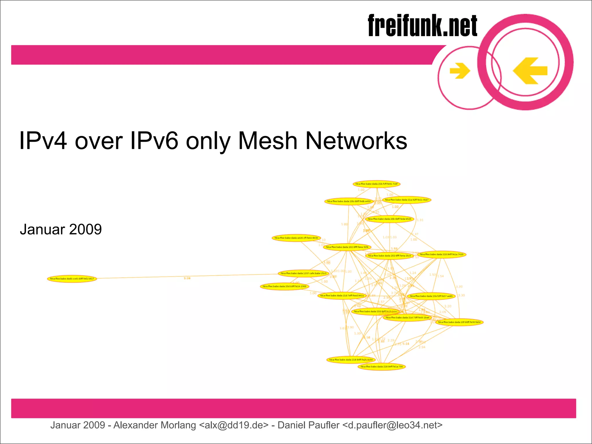 Das Dokument behandelt die Implementierung von IPv4 über IPv6 in Mesh-Netzwerken, um die Herausforderungen der Adressverknappung zu bewältigen. Es werden verschiedene Techniken wie Tunneling und Protokollübersetzung vorgestellt, um einen funktionierenden Übergang zu ermöglichen. Probleme und Lösungen werden erläutert, während der Ausblick auf mögliche zukünftige Entwicklungen wie die automatische Konfiguration und dynamisches DNS gerichtet ist.