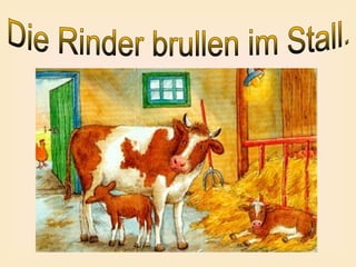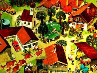 Das Dokument beschreibt verschiedene Aspekte des Lebens auf einem Bauernhof, einschließlich der Arbeitsbedingungen und der Tiere. Es erwähnt die Gebäude wie Haus, Stall und Scheune sowie die landwirtschaftlichen Maschinen und die Pflanzenproduktion. Zudem wird auf die traditionelle Kunst des Chochaoma in Russland eingegangen und abschließend auf tierische Laute hingewiesen.