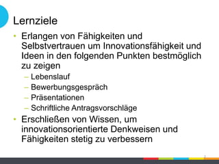 Das Dokument beschäftigt sich mit der Entwicklung von Innovationsfähigkeiten, die für Lebensläufe, Bewerbungsgespräche, Präsentationen und schriftliche Anträge unerlässlich sind. Es betont die Wichtigkeit von emotionaler Intelligenz und kontinuierlicher persönlicher Verbesserung durch Techniken wie Achtsamkeit und Selbstverwirklichung. Ziel ist es, die eigenen Fähigkeiten effektiv zu identifizieren, darzustellen und zu optimieren, um in der heutigen Arbeitswelt erfolgreich zu sein.