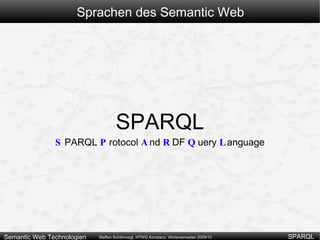 Das Dokument behandelt die Grundlagen und Anwendungen der SPARQL-Sprache, einschließlich ihrer Syntax und Anfragetypen wie SELECT, CONSTRUCT, ASK und DESCRIBE. Es werden Beispiele für einfache und komplexe Abfragen sowie die Verwendung von Variablen, Filtern und Modifikatoren zur Ergebnisverarbeitung vorgestellt. Darüber hinaus werden die Bedeutung von URIs, Literalen und Blank Nodes in SPARQL-Anfragen erläutert.
