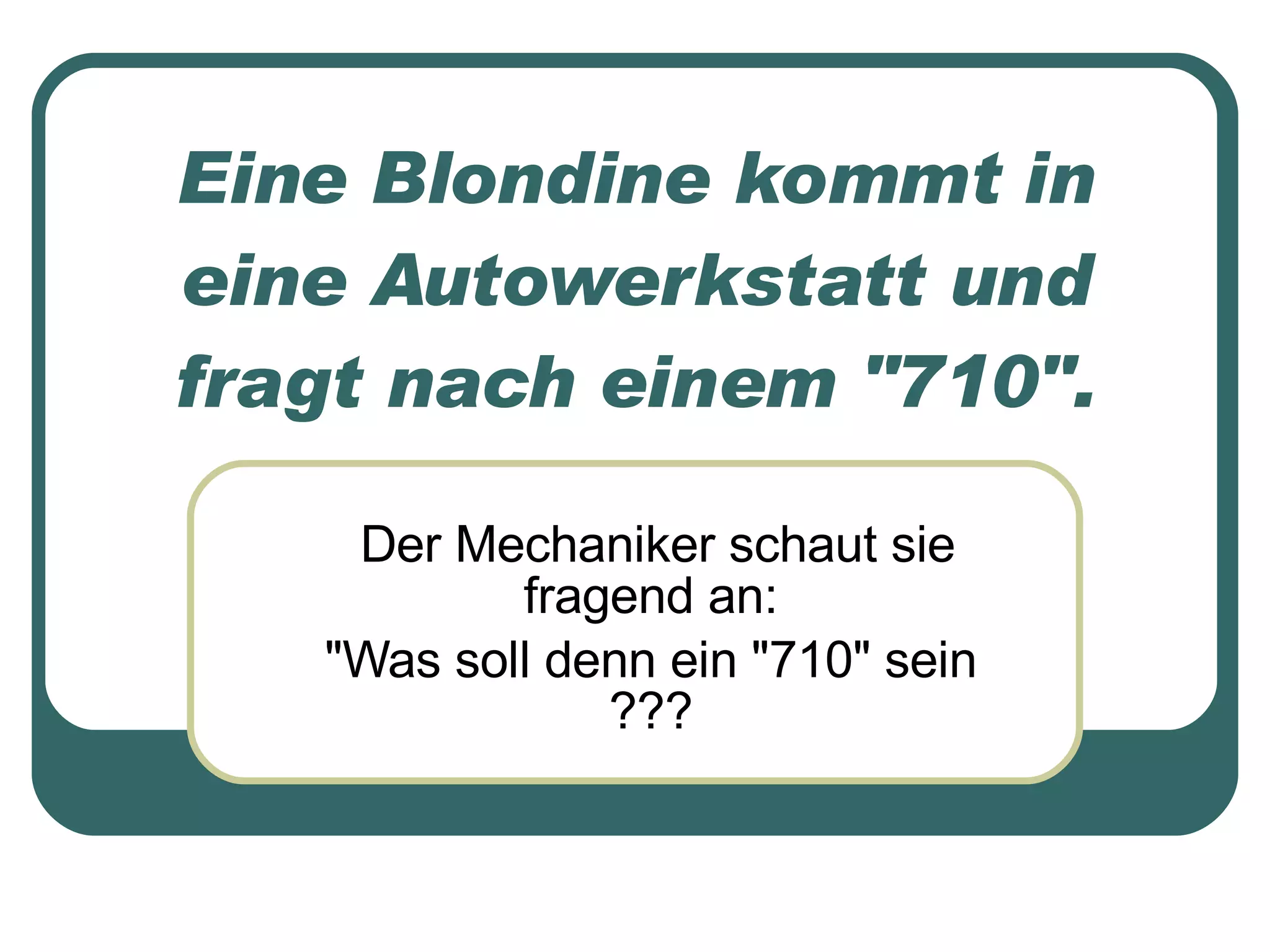 Eine Blondine kommt in eine Autowerkstatt und fragt nach einem '710', das sie verloren hat. Der Mechaniker hat keine Ahnung, was sie meint, bis sie es zeichnet und zeigt, dass es sich um einen kleinen Kreis im Motor handelt. Nach einigen Missverständnissen zeigt sie schließlich auf das Bauteil im Motorraum, was die Verwirrung aufklärt.