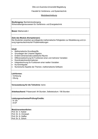 Das Dokument ist ein Modulhandbuch der Otto-von-Guericke-Universität Magdeburg für den Bachelorstudiengang Wirtschaftsingenieurwesen für Verfahrens- und Energietechnik. Es beschreibt verschiedene Module, wie Mathematik, Physik, Chemie und Technische Mechanik, und gibt detaillierte Informationen zu Zielen, Inhalten, Lehrformen, Arbeitsaufwand und Prüfungsleistungen. Die Module vermitteln essentielle Kompetenzen für die Studierenden zur Lösung ingenieurtechnischer Probleme.