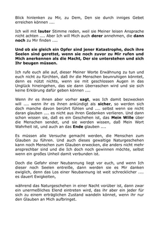 Das Dokument enthält eine Botschaft, die die Menschen auffordert, sich auf bevorstehende Veränderungen und Naturgeschehen vorzubereiten, die durch göttlichen Willen verursacht werden. Es betont die Notwendigkeit, den Glauben zu stärken und anderen von diesen Ereignissen zu berichten, damit sie nicht unvorbereitet in das Unheil geraten. Der Text ermutigt dazu, auch in schwierigen Zeiten Trost und Kraft durch Glauben zu finden.