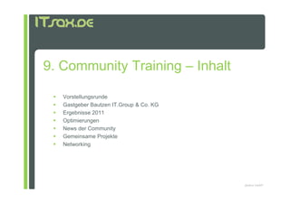 Das Dokument beschreibt die Ergebnisse und Optimierungen der 'IT Community' in den Jahren 2011, einschließlich Statistiken zu Partnern, Besuchern und Bewerbern. Es enthält Empfehlungen zur Verbesserung von Karriereseiten und der Nutzung von Empfehlungscodes sowie Ankündigungen zu anstehenden Projekten und Veranstaltungen. Zudem wird auf die Erstellung einer Gehaltsbenchmark für Softwareentwickler in Sachsen hingewiesen.