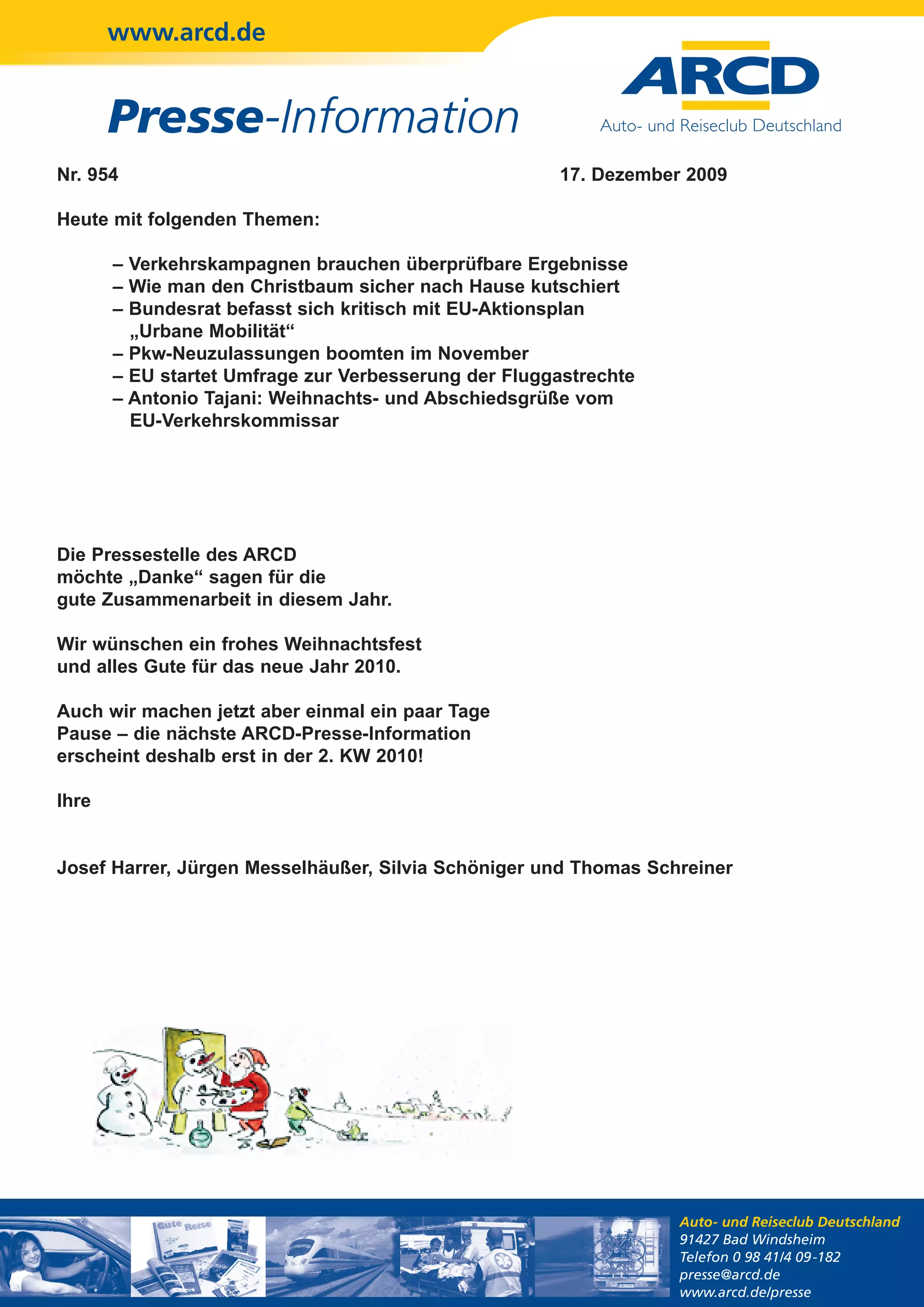 Die Presseinformation des ARCD vom 17. Dezember 2009 behandelt verschiedene Themen, darunter die Notwendigkeit überprüfbarer Ergebnisse in Verkehrskampagnen, Sicherheitsmaßnahmen beim Christbaumtransport und die kritische Auseinandersetzung des Bundesrats mit dem EU-Aktionsplan zur urbanen Mobilität. Zudem berichtet sie über einen Anstieg der Neuzulassungen von PKW im November 2009 und eine EU-Umfrage zur Verbesserung der Fluggastrechte. Antonio Tajani, der EU-Verkehrskommissar, schloss die Informationen mit Weihnachtsgrüßen und Empfehlungen für sicheres Reisen ab.