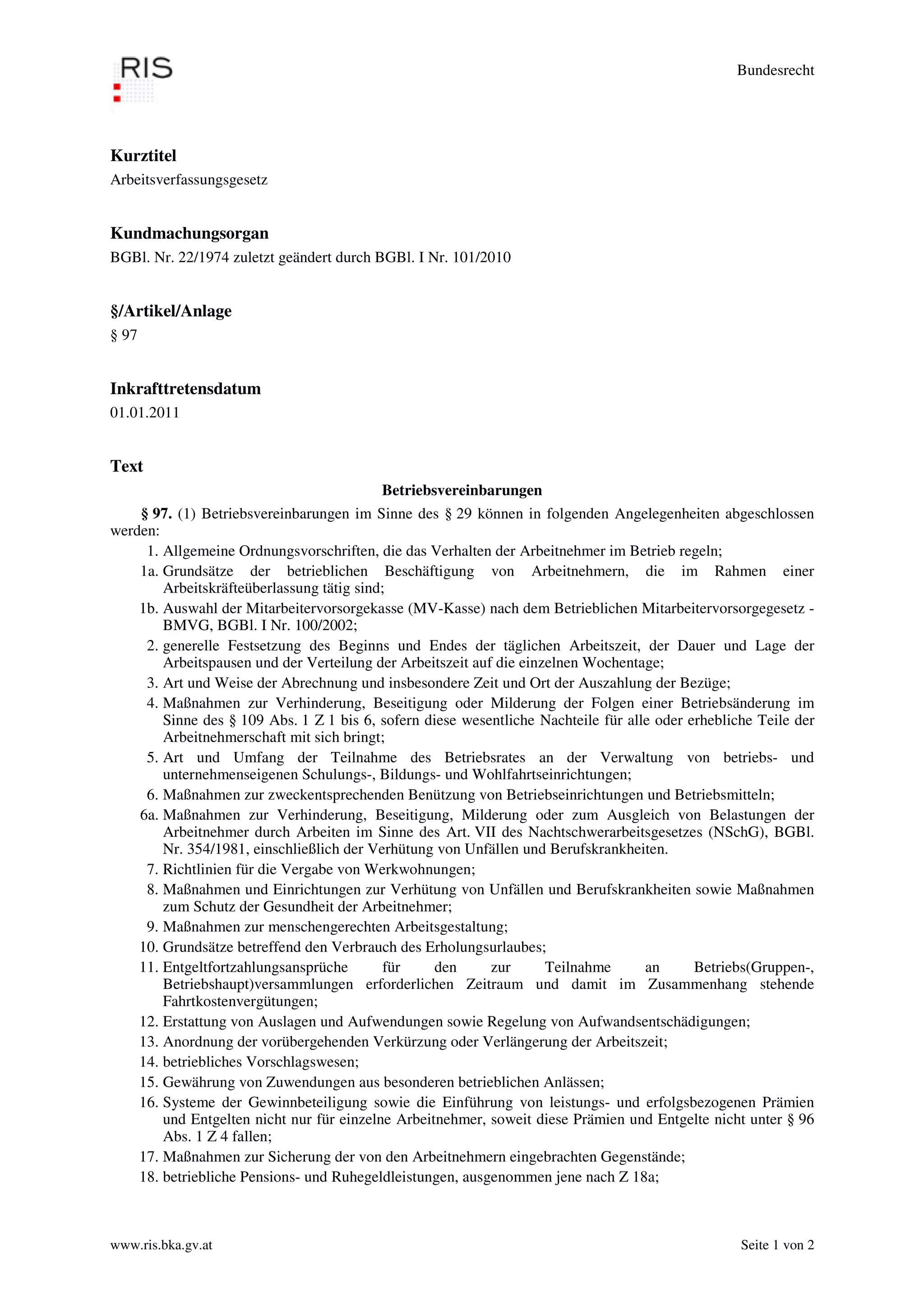 Das Arbeitsverfassungsgesetz regelt die Bedingungen für Betriebsvereinbarungen, die unter anderem allgemeine Ordnungsvorschriften, Arbeitszeitregelungen und Maßnahmen zur Arbeitnehmergesundheit umfassen. Es beschreibt die Zuständigkeiten zwischen Betriebsinhabern und Betriebsrat sowie das Verfahren bei Uneinigkeiten. Zudem sind spezielle Regelungen für kleinere Betriebe vorgesehen.