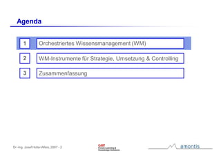 Das Dokument behandelt die erfolgreiche Transformation von Geschäften durch orchestriertes Wissensmanagement, das strategische Instrumente für Planung, Umsetzung und Controlling umfasst. Es definiert Wissensdimensionen und liefert praktische Ansätze zur Integration von Wissen in Unternehmensstrategien sowie zur Förderung von Innovation und Personalentwicklung. Der Vortrag von Dr.-Ing. Josef Hofer-Alfeis hebt die Bedeutung der Fokussierung auf kritische Wissensbereiche hervor, um Effektivität und Leistungssteigerung zu erzielen.