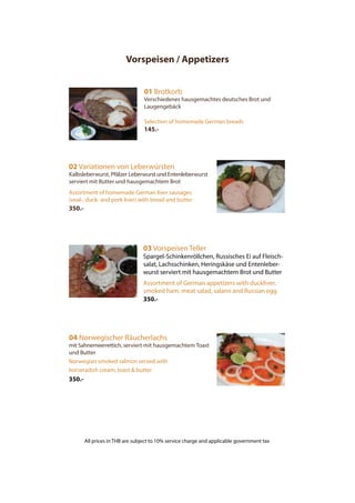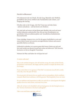 Das Dokument beschreibt das Restaurant 'bei otto', das seit 28 Jahren eine Mischung aus deutscher und thailändischer Gastronomie in Bangkok bietet und für seine Qualität und Atmosphäre bekannt ist. Neben der herzlichen Gastfreundschaft sind vielfältige deutsche Gerichte im Menü aufgeführt, darunter Vorspeisen, Salate, Suppen und Hauptspeisen. Gäste werden eingeladen, die authentischen Geschmackserlebnisse und das gemütliche Ambiente zu genießen.