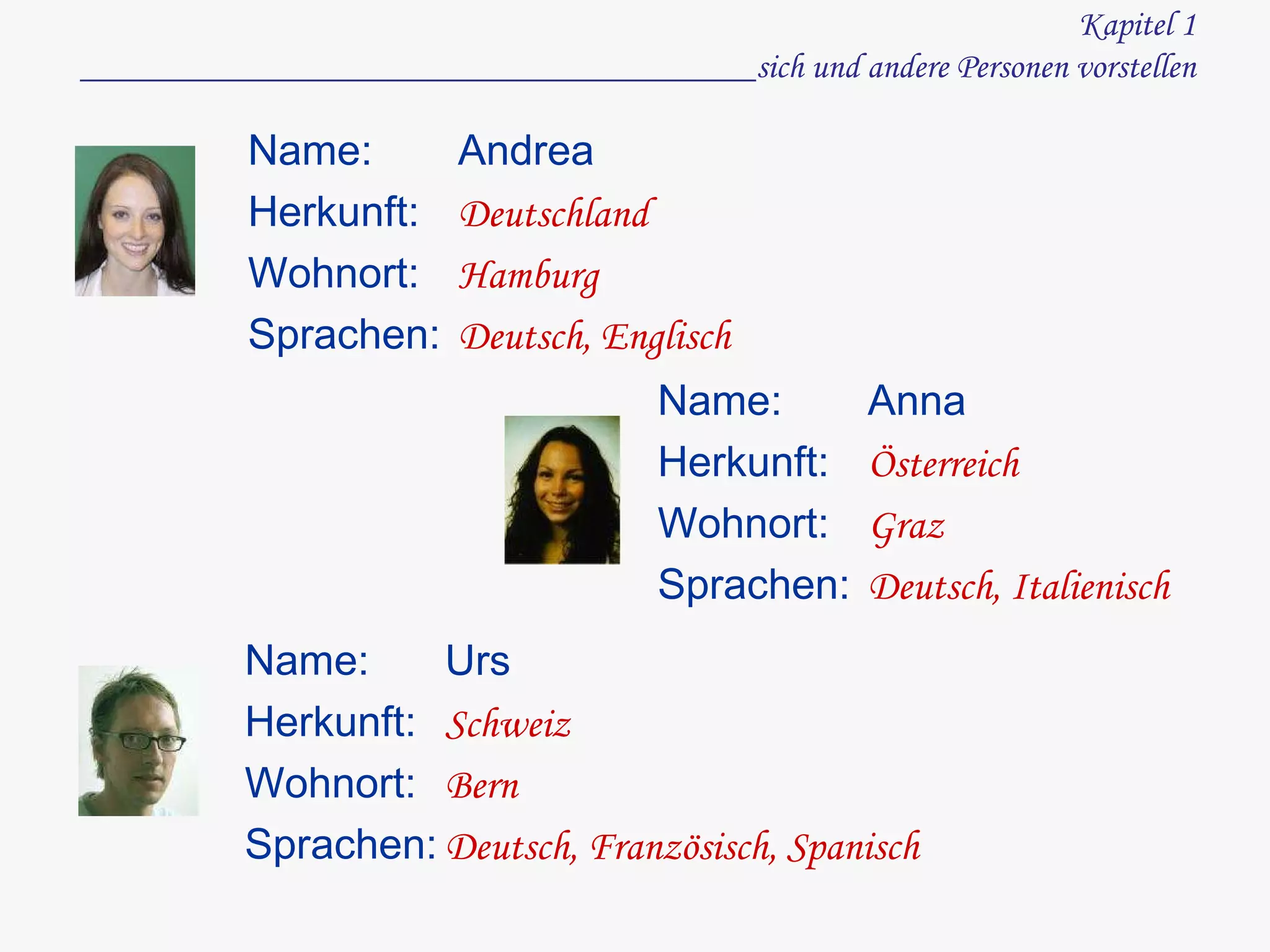 Das Dokument beschreibt verschiedene Personen, einschließlich ihrer Herkunft, Wohnorte und Sprachen, und vermittelt grundlegende Grammatikregeln der deutschen Sprache. Es enthält Informationen zu Verben, w-fragen, Zahlen, dem Alphabet und resumierende Dialoge für den Spracherwerb. Zudem werden Beispiele für persönliche Informationen und Interviews gegeben.