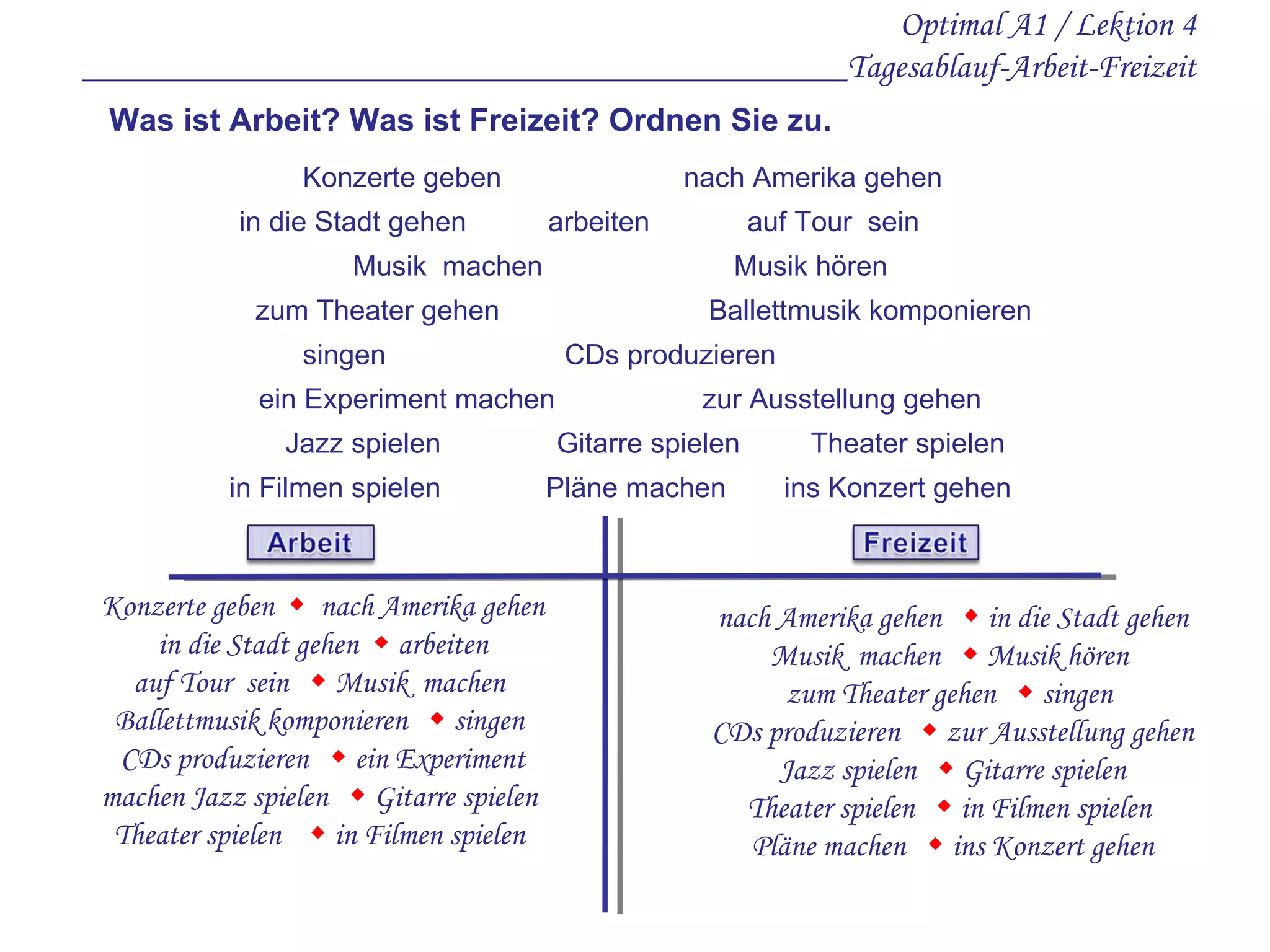 Das Dokument behandelt verschiedene Aspekte des Tagesablaufs, Arbeit und Freizeit sowie Berufe wie Musiker und Journalist. Es enthält Übungen zur Satzbildung und Aufgaben zur Zuordnung von Tätigkeiten zu den Themen Arbeit und Freizeit. Außerdem werden Beispiele für den Gebrauch von Zeitformen und personalisierten Sätzen gegeben.