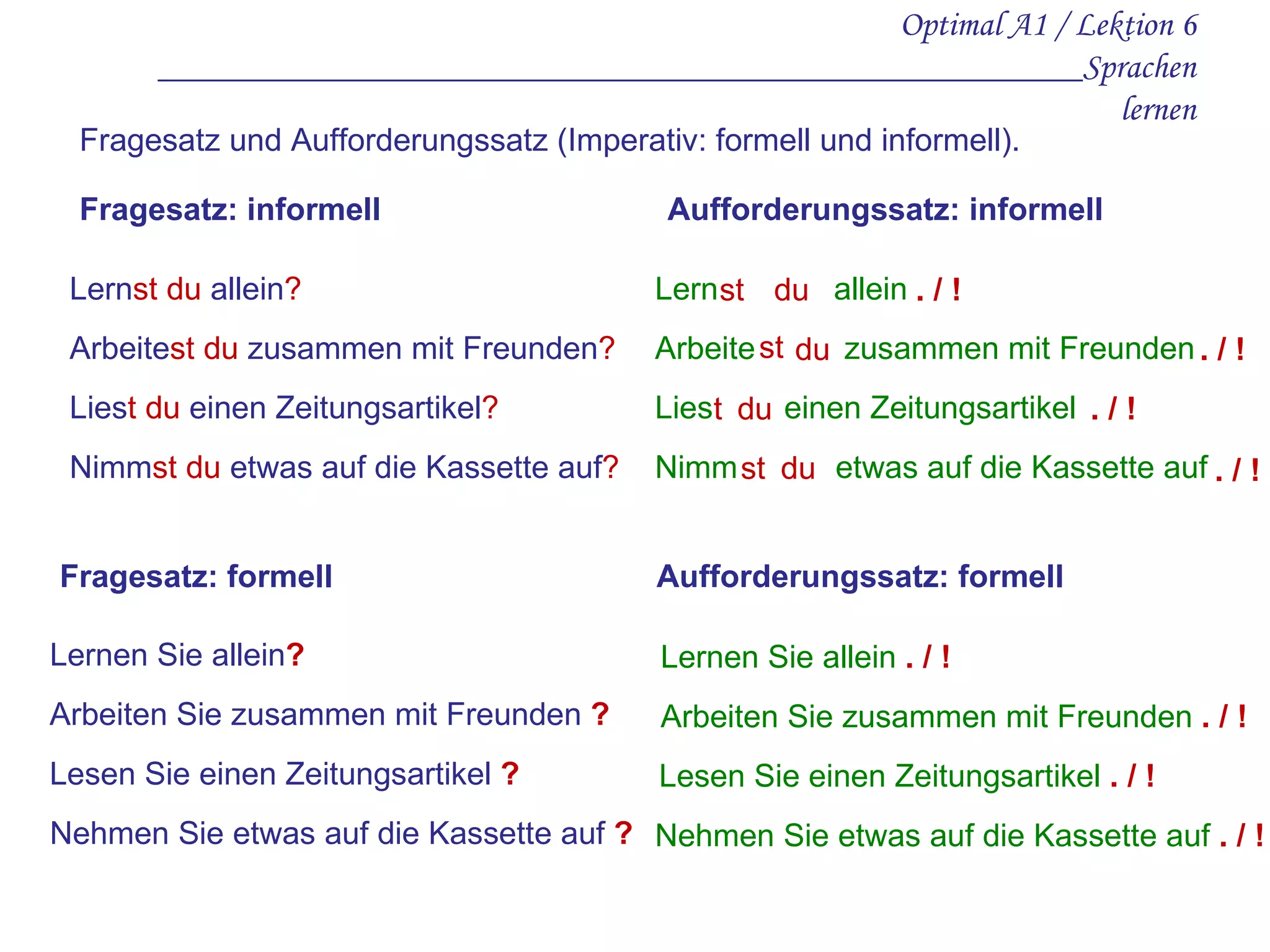 Das Dokument behandelt den Fragesatz und den Aufforderungssatz im Deutschen, sowohl in informeller als auch formeller Form. Es beschreibt spezifische Fragen und Aufforderungen, die in Lernkontexten verwendet werden, einschließlich im Unterricht benötigter Materialien im Akkusativ und Dativ. Die Übungen zeigen Beispiele für den Gebrauch von Präpositionen mit Nomen im Dativ.