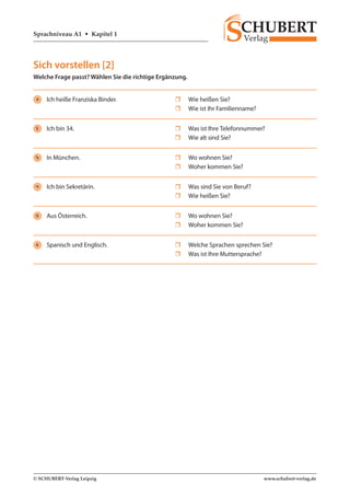 Das Dokument befasst sich mit grundlegenden Themen des Sprachniveaus A1, darunter die Vorstellung von Personen, Fragen zu persönlichen Informationen, die Nutzung von Verben, Zahlen, Sprachen und die Beschreibung von Berufen. Es enthält Übungen zur Grammatik, zum Wortschatz und zu Dialogen im Büro sowie Informationen zu Deutschland, Österreich und der Schweiz. Insgesamt dient es als Lernmaterial für Anfänger der deutschen Sprache.