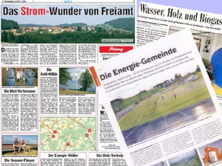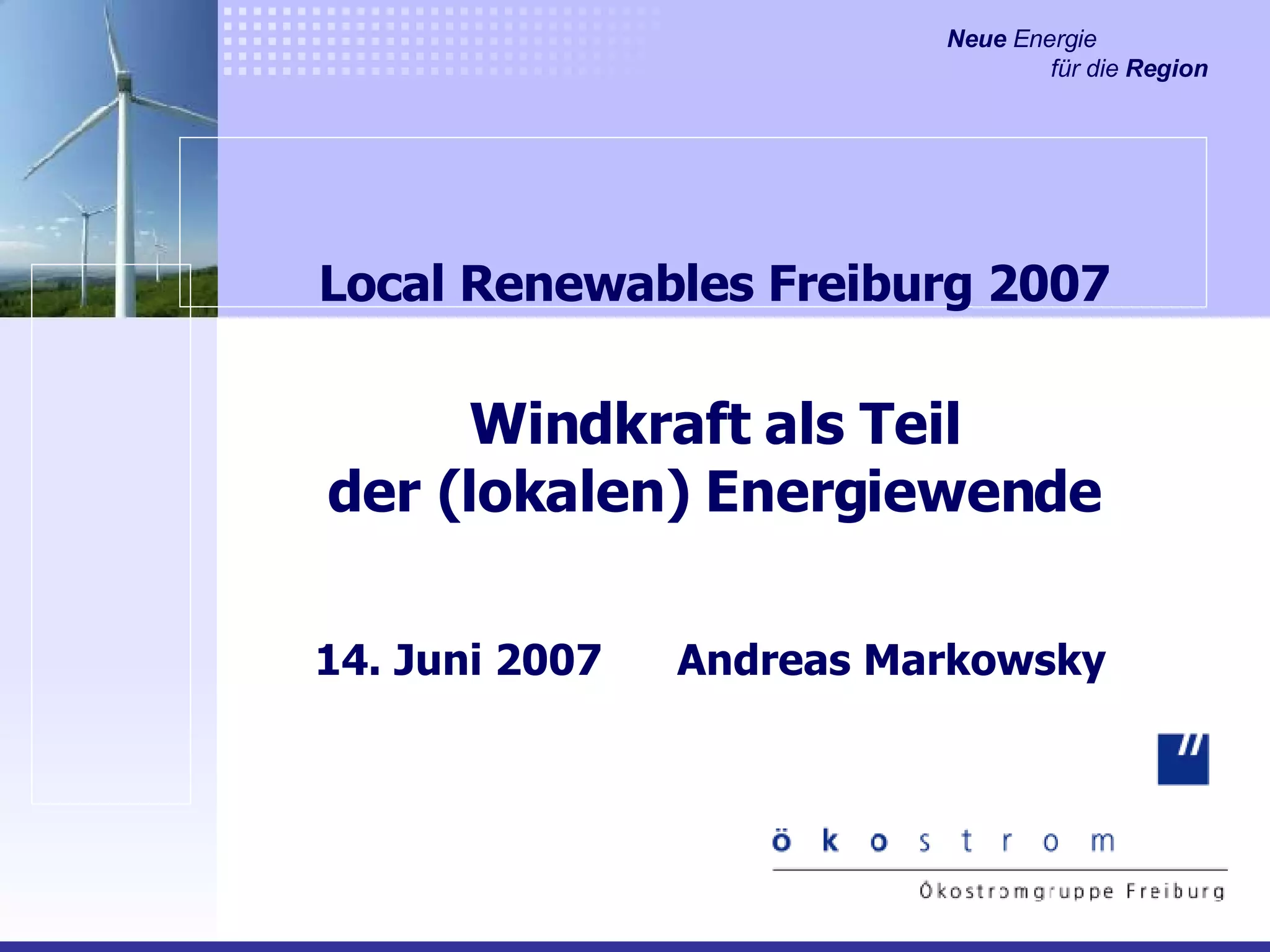 Das Dokument beschreibt die Rolle der Windkraft in der lokalen Energiewende von Freiburg im Jahr 2007. Es wird ein Windpark erwähnt, der von Bürgern finanziert und verwaltet wird und Strom für 6.000 Haushalte liefert. Zudem wird auf den bundesweiten Ausbau erneuerbarer Energien hingewiesen.