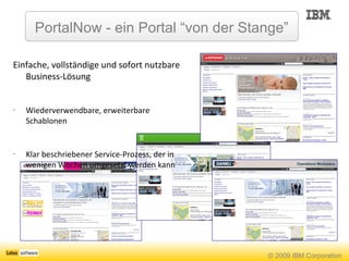 Das Dokument beschreibt das PortalNow-Template von IBM als benutzerfreundliche Lösung zur Verbesserung der internen und externen Kommunikation in Unternehmen. Es bietet eine schnelle Implementierung innerhalb von drei Wochen und umfasst Funktionen wie personalisierte Inhalte, Kollaborationstools und optimierte Informationsverarbeitung. Die Vorteile umfassen höhere Produktivität, reduzierte Betriebskosten und verbesserte Kundenbindung durch einfacheren Zugriff auf Informationen für Mitarbeiter und Partner.