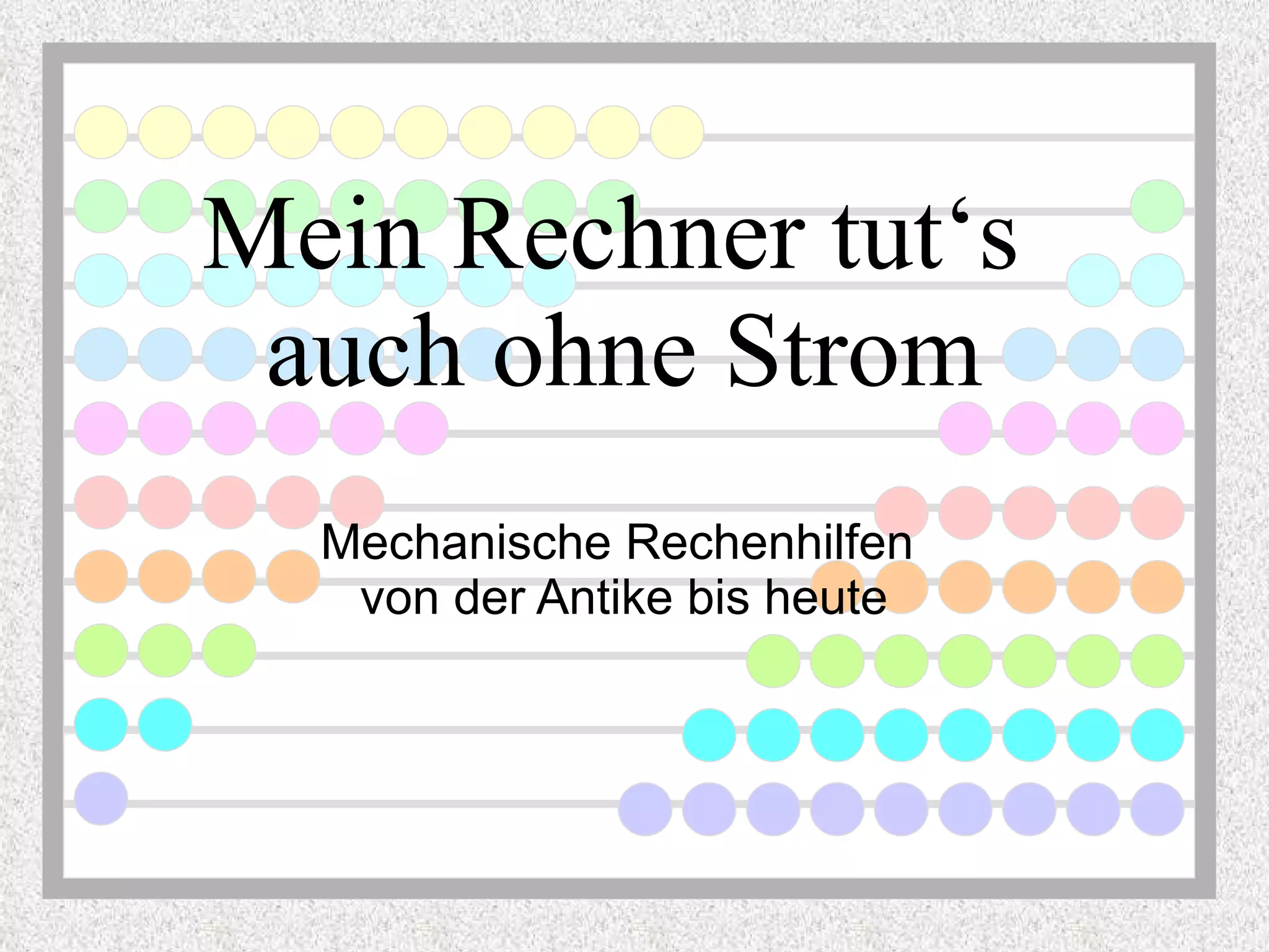 Das Dokument beschreibt die Entwicklung mechanischer Rechenhilfen von der Antike bis zur modernen Zeit, beginnend mit Rechenbrettern bei den Persern vor 3000 Jahren und weiter über den Abakus und die Multiplikationsstäbchen von Napier bis hin zu komplexen Rechenmaschinen wie der von Wilhelm Schickard und der Curta. Es wird erläutert, wie verschiedene Maschinen und Techniken zur Erleichterung der Berechnungen genutzt wurden, einschließlich der Einführung der Kurbelmechanik durch Leibniz. Abschließend wird festgestellt, dass elektrische Rechner heute schneller, vielseitiger und kostengünstiger sind als ihre mechanischen Vorgänger.