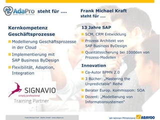 Frank Michael Kraft von der Adapro GmbH ist Experte für SAP-Geschäftsprozesse im Bereich SCM und CRM mit 13 Jahren Erfahrung. Er bietet Beratungsdienste, Schulungen und Webinare zur Geschäftsprozessmodellierung sowie zur Integration von Software in der Cloud an. Kraft ist Mitautor mehrerer Fachbücher und engagiert sich auch in der Lehre und Projektarbeit, um die Kundenzufriedenheit zu erhöhen.