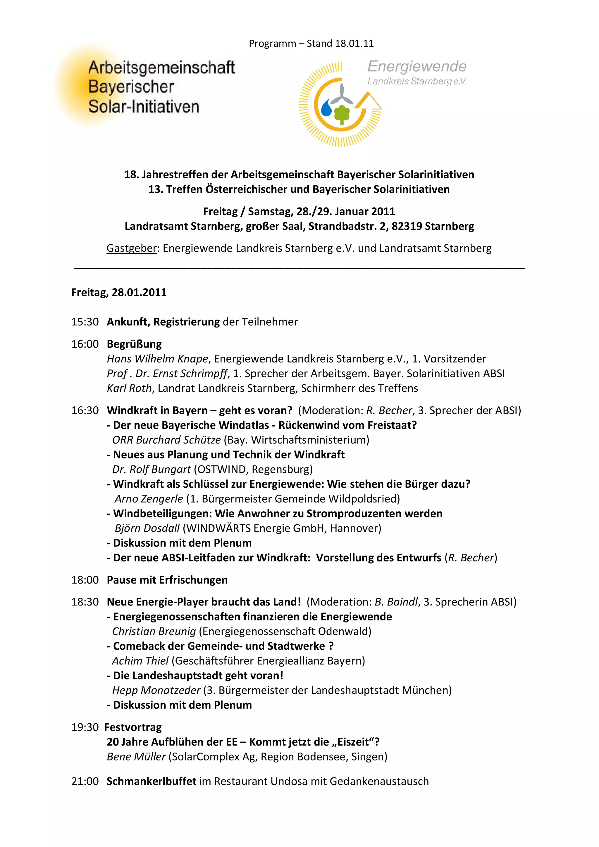 Das Dokument beschreibt das Programm des 18. Jahrestreffens der Arbeitsgemeinschaft bayerischer Solarinitiativen, das am 28. und 29. Januar 2011 in Starnberg stattfindet. Es umfasst verschiedene Vorträge und Diskussionen zu Themen wie Windkraft, Energiegenossenschaften und aktuelle Perspektiven der erneuerbaren Energien in Bayern. Die Veranstaltung beinhaltet auch Workshops und eine Podiumsdiskussion zur Energiepolitik bis 2050.