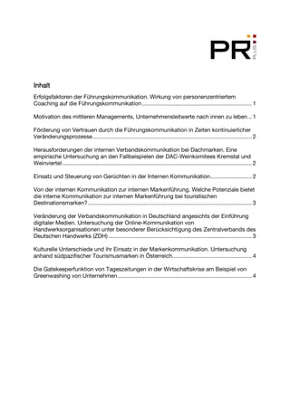 Das Dokument thematisiert verschiedene Masterarbeiten im Bereich der Kommunikationswissenschaften, die Aspekte wie Führungskommunikation, interne Markenführung und die Auswirkungen digitaler Medien auf Verbandskommunikation untersuchen. Es bietet Einblicke in empirische Studien über die Herausforderungen und Erfolgsfaktoren in der Kommunikationspraxis innerhalb von Unternehmen und Verbänden, sowie den Einfluss kultureller Unterschiede. Zudem wird die Rolle von Journalisten in der gatekeeper-Funktion und deren Handhabung von greenwashing in der wirtschaftlichen Krise analysiert.