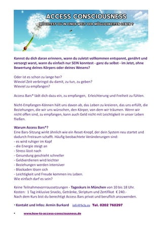 Access Bars ist eine grundlegende Methode von Access Consciousness, die durch sanftes Berühren von 32 Punkten am Kopf Blockaden und begrenzende Muster auflösen kann, um das Empfangen von Möglichkeiten zu fördern. Die Methode verspricht Veränderungen in verschiedenen Lebensbereichen wie Gesundheit, Beziehungen und finanzieller Wohlstand und ermöglicht es den Menschen, ihr Leben aus einer neuen Perspektive zu betrachten. Access zielt darauf ab, das Bewusstsein und die Einheit mit der Umwelt zu fördern und bietet Werkzeuge an, um das individuelle Potenzial zu erkennen und zu entfalten.