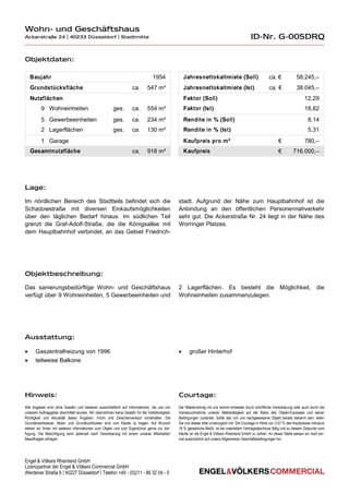 Das Dokument beschreibt ein Wohn- und Geschäftshaus in der Ackerstraße 24 in Düsseldorf mit einer Gesamtnutzfläche von ca. 918 m², einer Solljahresnettokaltmiete von etwa 58.245 € und einem Kaufpreis von 716.000 €. Das Gebäude, baujahr 1954, besteht aus 9 Wohneinheiten, 5 Gewerbeeinheiten und 2 Lagerflächen, und ist sanierungsbedürftig. Weitere Details beinhalten die Lage, Ausstattung, sowie Hinweise zur Courtage und Bedingungen des Maklervertrags.