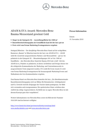 Der Mercedes-Benz Stand auf der bauma 2010 in München wurde mit dem Gold-Award von Adam & Eva in der Kategorie für Messestände bis 1500 m² ausgezeichnet. Die Jury lobte den innovativen Baustelleneinrichtungsplan, der die Zielgruppe der Trucker erfolgreich anspricht. Der Preis würdigt Projekte, die Architektur, Design und die Kommunikation von Marketing- und Unternehmenszielen hervorragend umsetzen.