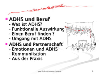 Das Dokument behandelt die Herausforderungen und Stärken von Menschen mit ADHS im beruflichen und privaten Leben und betont die Notwendigkeit, einen individuellen Umgang mit der Erkrankung zu entwickeln. Es beschreibt Symptome, emotionale Schwierigkeiten, sowie Möglichkeiten zur Selbstorganisation und Unterstützung. Außerdem wird auf die positiven Eigenschaften der Betroffenen hingewiesen, die in verschiedenen beruflichen Kontexten von Vorteil sein können.