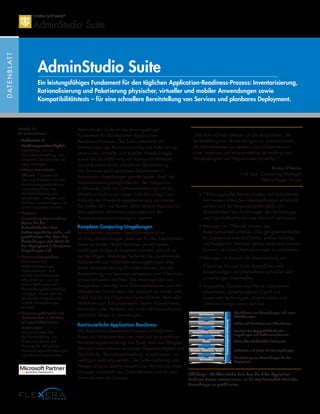 Die AdminStudio Suite von Flexera bietet eine umfassende Lösung für den Application-Readiness-Prozess, einschließlich der Inventarisierung, Rationalisierung, Paketierung und Durchführung von Kompatibilitätstests für physische, virtuelle und mobile Anwendungen. Dies verbessert die IT-Servicebereitstellung, erhöht die betriebliche Effizienz und ermöglicht eine planbare Anwendungsbereitstellung in komplexen Umgebungen. Die Automatisierungsmöglichkeiten und Workflow-Funktionen der Suite helfen IT-Abteilungen, Ressourcen effizienter zu verwalten und sicherzustellen, dass Anwendungen jederzeit einsatzbereit sind.