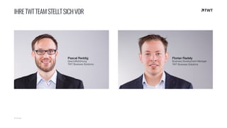 Das Dokument präsentiert die TWB Business Solutions als Google-Partner, der Lösungen zur Adressvalidierung mittels Google Maps für CRM und E-Commerce anbietet. Es wird die Problematik fehlerhafter Adressdaten hervorgehoben, die durch menschliche Fehler und geografische Veränderungen entstehen, und die Lösung umfasst eine automatische Validierung und Korrektur dieser Daten. Die angebotenen Dienste zielen darauf ab, die Eingabequalität zu erhöhen, Kosten zu senken und die Kundenzufriedenheit zu verbessern.