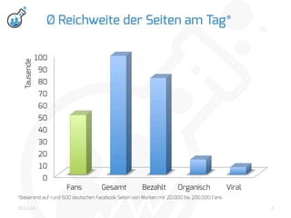 Das Dokument bietet eine Analyse der Reichweite von Facebook-Seiten deutscher Marken mit 20.000 bis 200.000 Fans, bei der 81% der Reichweite aus bezahlten Anzeigen stammen. Es wird gezeigt, dass 53% dieser Seiten Anzeigen schalten, während die Entwicklung von organischer und viralem Wachstum über mehrere Monate verfolgt wird. Die durchschnittliche Anzahl der Beiträge zeigt einen leichten Rückgang über den betrachteten Zeitraum von Juli bis Dezember.