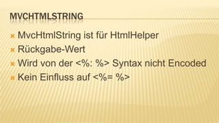 Das Dokument behandelt die Implementierung und Nutzung von `MvcHtmlString` in ASP.NET MVC sowie die verschiedenen Filter-Methoden wie `OnActionExecuting` und `OnResultExecuting`. Es beleuchtet die Herausforderungen der Dependency Injection und den Einsatz von Action-Filtern, die von den entsprechenden Schnittstellen abhängen. Außerdem werden Konzepte zur Client-seitigen Validierung und der Implementierung von Model-Bindern vorgestellt, um die Anforderung von Modellen aus Anfragen zu verarbeiten.