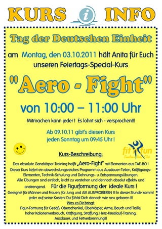 Am Montag, den 03.10.2011, bietet Anita einen Feiertags-Special-Kurs namens „Aero-Fight“ an, der Elemente aus Tae-Bo beinhaltet und um 10:00 Uhr beginnt. Ab dem 09.10.11 findet dieser Kurs jeden Sonntag um 09:45 Uhr statt und verspricht ein effektives Ganzkörper-Training für alle Altersgruppen. Der Kurs fokussiert sich auf Figurformung, Kalorienverbrauch, Kräftigung und Ausdauer.