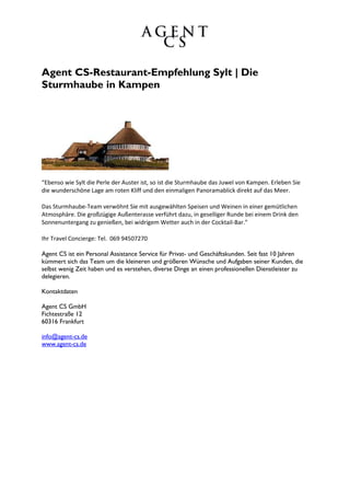 Die Sturmhaube in Kampen auf Sylt bietet eine außergewöhnliche Lage am roten Kliff mit Panoramablick auf das Meer und serviert ausgewählte Speisen und Weine in gemütlicher Atmosphäre. Die großzügige Außenterrasse lädt ein, den Sonnenuntergang bei einem Drink zu genießen. Agent CS ist ein Personal Assistance Service, der seit fast 10 Jahren private und geschäftliche Kunden bei ihren Wünschen und Aufgaben unterstützt.