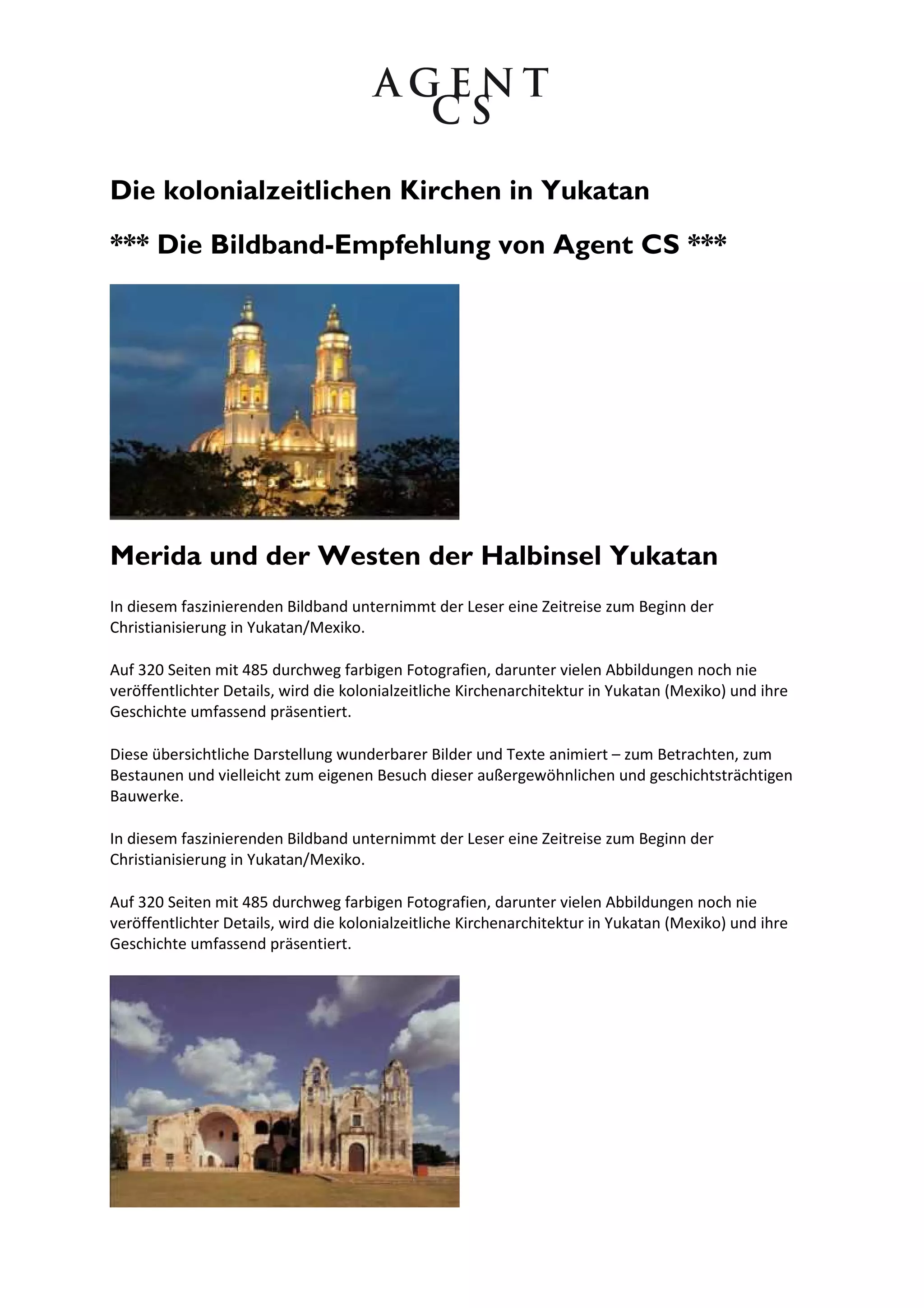 Der Bildband über kolonialzeitliche Kirchen in Yucatán präsentiert auf 320 Seiten und mit 485 farbigen Fotografien die Architektur und Geschichte dieser Bauwerke, beginnend mit der Christianisierung in Mexiko. Die informativen Texte und neu veröffentlichten Details laden zur Bewunderung und zum Besuch der historischen Stätten ein. Herausgegeben von der Summanus GmbH kostet das Buch 39,90 Euro.