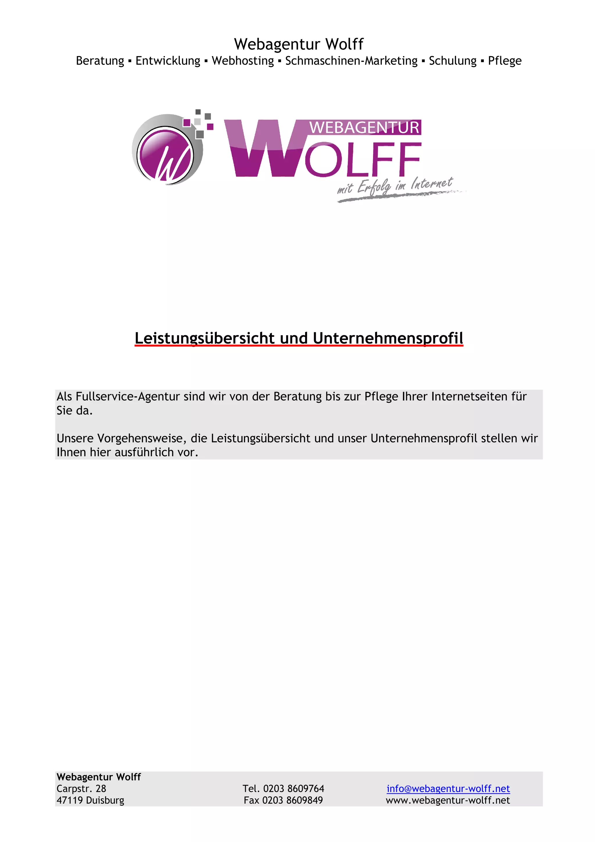 Die Webagentur Wolff bietet umfassende Dienstleistungen von der Beratung über die Webentwicklung bis zum Suchmaschinenmarketing an, um Unternehmen bei ihrer Online-Präsenz zu unterstützen. Zu ihren Leistungen gehören die Erstellung individueller Webseiten, Webhosting, Suchmaschinenoptimierung sowie Schulungen zur eigenständigen Pflege der Inhalte. Die Agentur legt großen Wert auf eine nachhaltige Sichtbarkeit in Suchmaschinen und hilft ihren Kunden, das volle Potenzial ihrer Webseiten auszuschöpfen.
