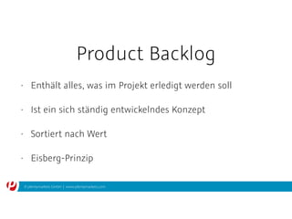 Das Dokument beschreibt die Kenntnisse zur agilen Projektplanung, insbesondere zur Erstellung und Verwaltung von Product Backlogs sowie User Stories. Es betont die Wichtigkeit des INVEST-Prinzips für User Stories und erläutert Methoden zur Schätzung des Umfangs von Aufgaben im Vergleich zu anderen Stories, einschließlich Techniken wie Planning Poker. Zudem werden Durchschnittswerte und Prognosen zur Fertigstellung von User Stories unter Verwendung von Velocity und Sprints vorgestellt.