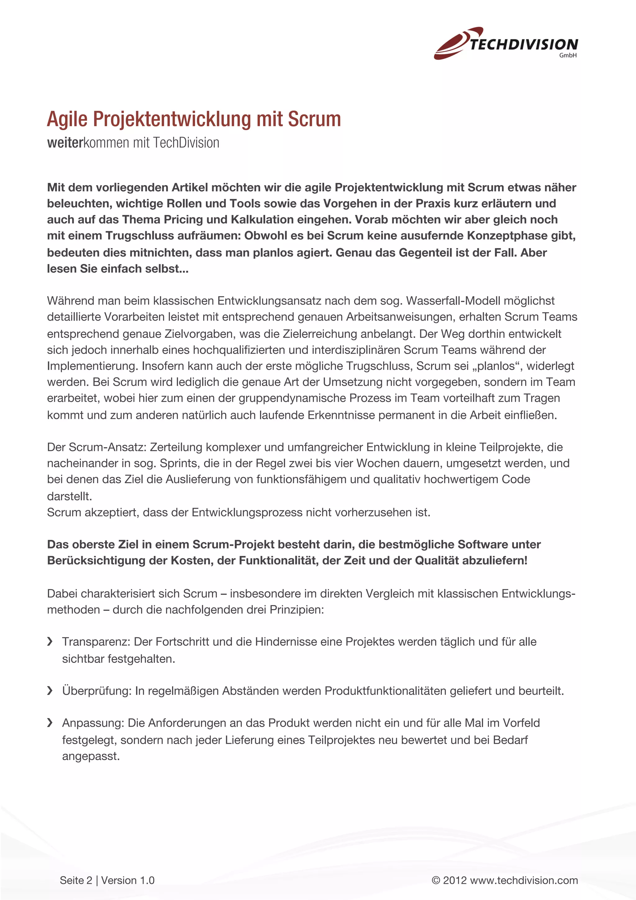 Der Artikel erläutert die agile Projektentwicklung mit Scrum, wobei er die grundlegenden Rollen, den Prozess und wichtige Werkzeuge beschreibt. Scrum ermöglicht es, große Entwicklungsprojekte in kleinere, manageable Sprints zu zerlegen, die eine kontinuierliche Lieferung funktionierender Software und Anpassungen auf Basis neuer Erkenntnisse fördern. Dabei wird Transparenz, regelmäßige Überprüfung und Anpassung der Anforderungen hervorgehoben, um den maximalen Nutzen für den Kunden zu gewährleisten.