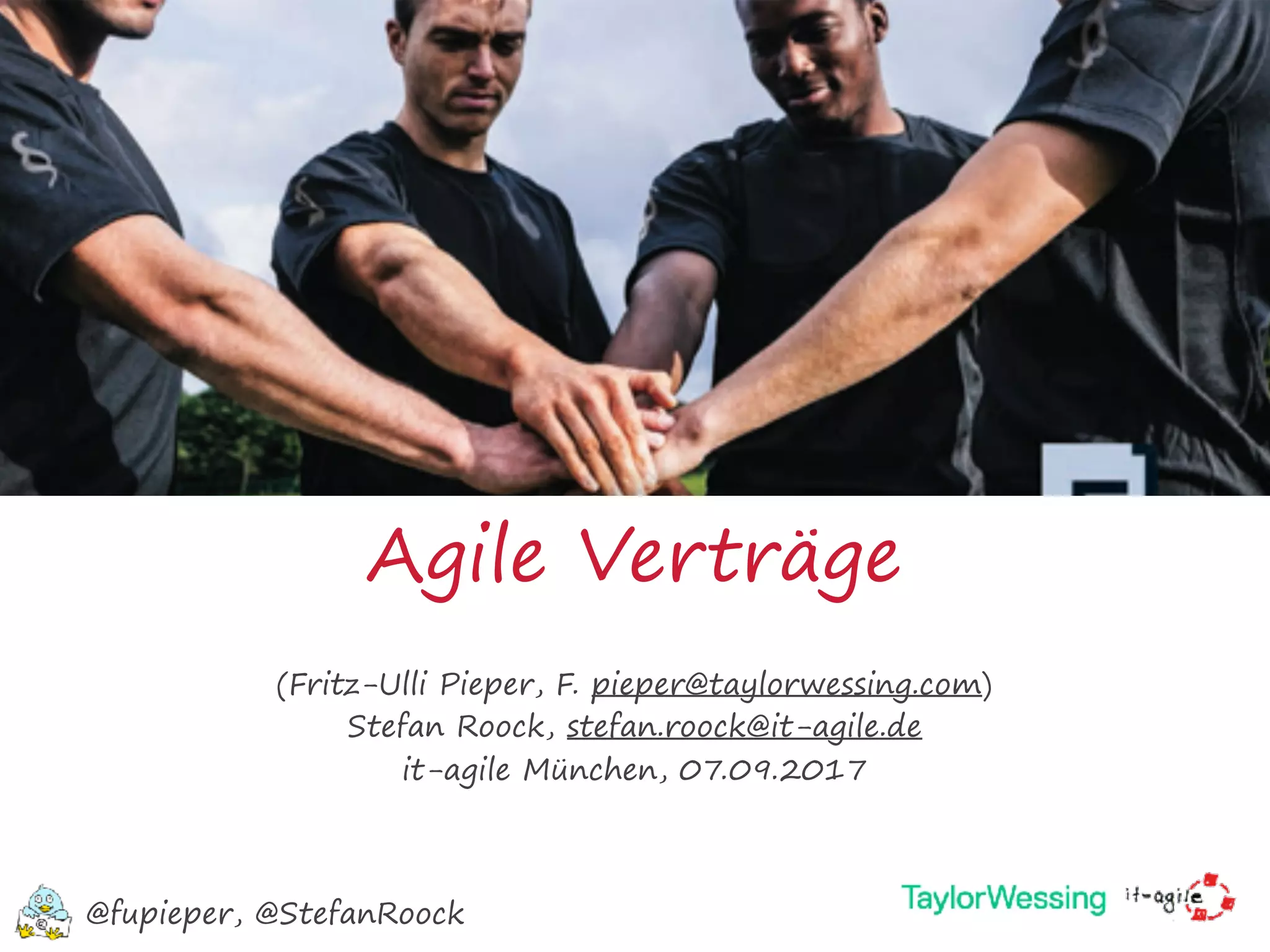 Der Vortrag behandelt die rechtlichen Grundlagen und Herausforderungen von Verträgen in der agilen Softwareentwicklung, einschließlich der Unterscheidung zwischen verschiedenen Vertragstypen wie Werk- und Dienstverträgen. Es wird betont, dass agile Verträge nicht nur Ergebnisse erfordern, sondern auch die Zusammenarbeit zwischen den Parteien festlegen sollten, wobei nutzenorientierte Modelle tendenziell besser geeignet sind als kostenorientierte. Wichtige Aspekte wie Risikomanagement, Bezahlung und die Definition von Leistungsbeschreibung sowie Rollen werden ebenfalls thematisiert.