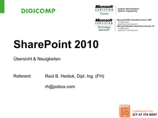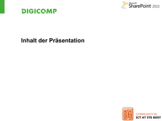 Die Präsentation zu SharePoint 2010 umfasst eine Übersicht über relevante Neuerungen, wie die Multifunktionsleiste, integrierte mobile Anwendungen und verbesserte Benutzeroberflächen. Schlüsselthemen sind auch die Unterstützung von Inhalten, Metadaten, erweiterte Suchfunktionen und Möglichkeiten der Zusammenarbeit. Zudem werden die Analyse- und Entscheidungsunterstützung durch verbesserte Datenvisualisierung und Integration von Unternehmensdaten hervorgehoben.