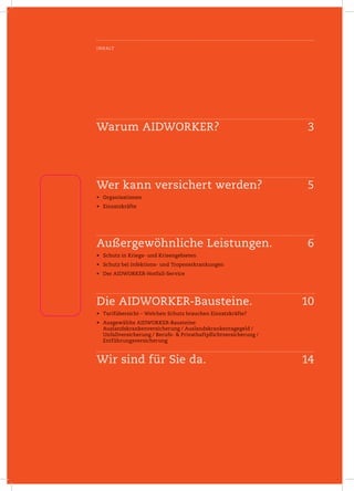 Das Dokument beschreibt die speziellen Versicherungsleistungen von 'aidworker' für freiwillige Helfer, Entwicklungshelfer, Missionare und andere Fachkräfte, die in Risikogebieten tätig sind. 'Aidworker' bietet umfassenden Schutz, einschließlich Kranken-, Unfall- und Haftpflichtversicherungen, speziell zugeschnitten auf die Bedürfnisse dieser Einsatzkräfte, sowie einen 24-Stunden-Notfall-Service. Durch individuelle Versicherungslösungen gewährleistet 'aidworker' einen effektiven Schutz auch in Konflikt- und Krisengebieten, unabhängig von Reisewarnungen.
