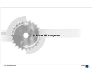 Das Dokument beschreibt die Facility Management-Pyramide und das Steuerungscockpit der AIS Management GmbH, das strategische und operative Aspekte des Facility Managements behandelt. Es betont die Bedeutung der Ausrichtung auf Know-how, Kapazitäten und die Unternehmensstrategie. Kontaktdaten und weitere Informationen zum Dienstleistungsangebot sind ebenfalls enthalten.