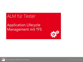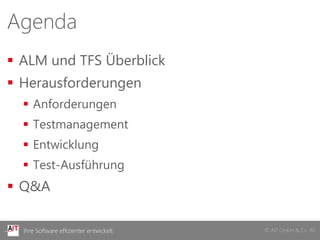 Das Dokument bietet einen umfassenden Überblick über Application Lifecycle Management (ALM) und die Herausforderungen sowie Anforderungen im Zusammenhang mit Team Foundation Server (TFS). Es beinhaltet Themen wie Testmanagement, Entwicklung und Testausführung. Zudem werden Dienstleistungen wie Software-Engineering, Architektur-Coaching und Beratungen im Visual Studio-Umfeld beschrieben.