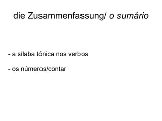 Das Dokument behandelt die wichtigsten Aspekte der deutschen und portugiesischen Sprache, einschließlich des Wortakzents bei Verben, der Zahlen von 1 bis 100 sowie der Formulierung und Beantwortung einfacher Fragen über Namen, Geschwister, Sprachen und Telefonnummern. Es bietet sowohl den deutschen Text als auch die portugiesische Übersetzung an. Ziel ist es, Einsteiger in die Grundlagen der beiden Sprachen zu unterstützen.