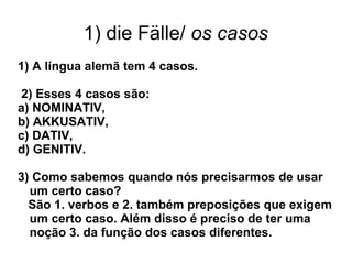 Das Dokument behandelt die Verwendung des unbestimmten Artikels im Nominativ und Akkusativ sowie die vier deutschen Fälle: Nominativ, Akkusativ, Dativ und Genitiv. Es werden Beispiele für die Verwendung der Fälle in Bezug auf Verben, Präpositionen und die Einflussnahme auf Nomen, Artikel, Pronomen und Adjektive gegeben. Außerdem wird die Struktur von Komposita und die spezifische Bedeutung im Deutschen erläutert.