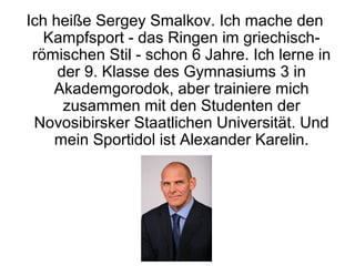 Sergey Smalkov, Schüler der 9. Klasse in Akademgorodok, praktiziert seit 6 Jahren griechisch-römisches Ringen und bewundert Alexander Karelin, der zahlreiche olympische und weltmeisterliche Titel gewonnen hat. Karelin, bekannt für seine Stärke und Entschlossenheit, hat seine Karriere nach den Olympischen Spielen in Sydney beendet und eine Stiftung zur Förderung des griechisch-römischen Kampfes gegründet. Smalkov nahm erfolgreich an einem Wettkampf in Karelins Namen teil und gewann 2010 den ersten Preis unter Jugendlichen.