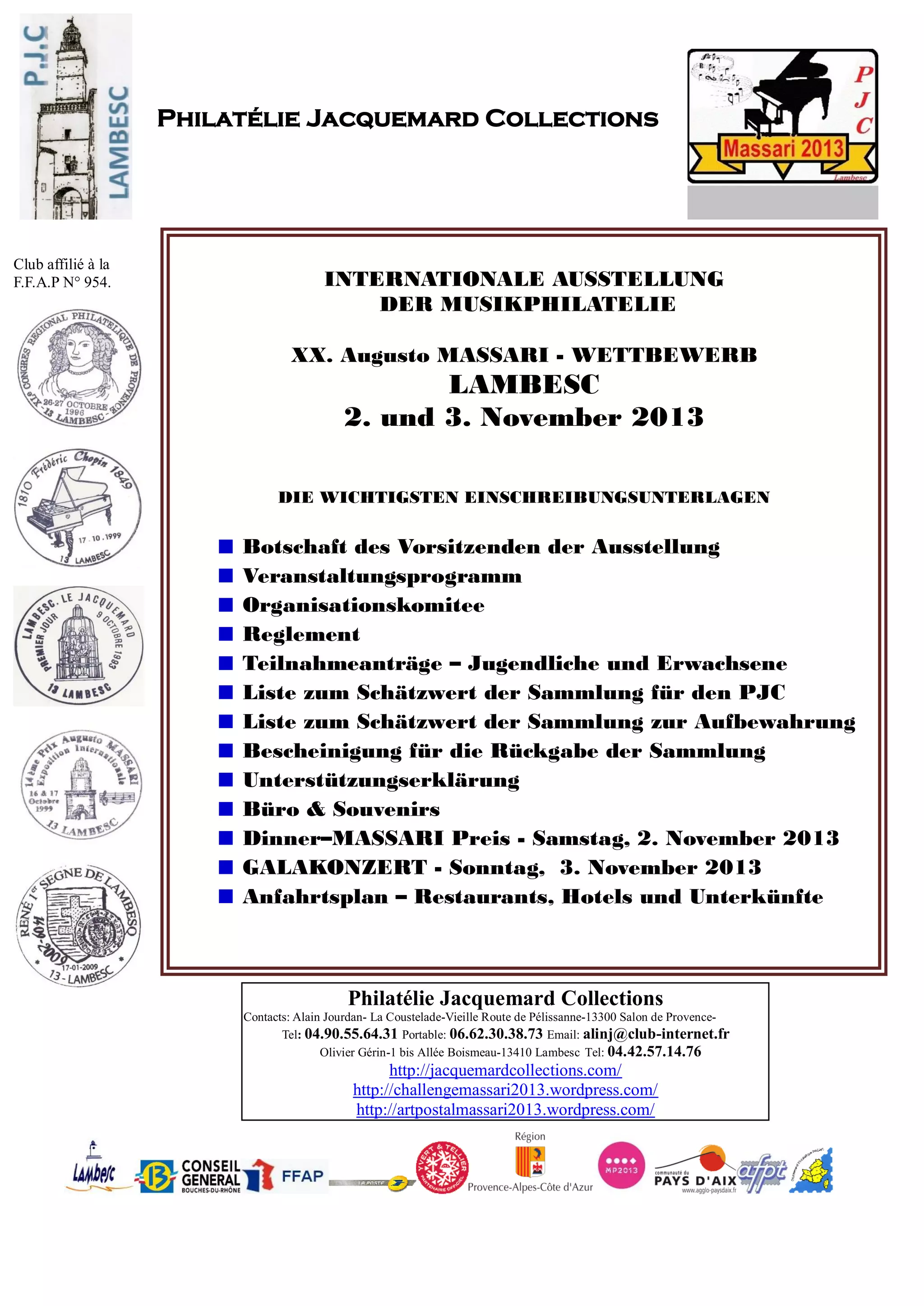 Die Philatelie Jacquemard Collections organisiert die internationale Ausstellung der Musikphilatelie, die am 2. und 3. November 2013 in Lambesc stattfindet. Die Veranstaltung umfasst verschiedene Wettbewerbsarten im Bereich Musikphilatelie und beinhaltet ein Veranstaltungsprogramm mit Preisverleihungen und einem Abschlusskonzert. Die Teilnahme ist kostenlos, und Aussteller müssen ihre Anmeldungen bis zum 10. September 2013 einreichen.
