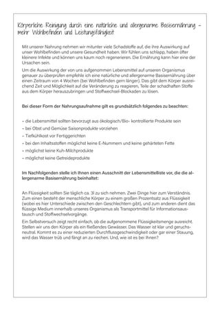 Das Dokument beschreibt die Vorteile einer allergenarmen und natürlichen Basisernährung zur körperlichen Reinigung und Verbesserung des Wohlbefindens. Empfohlen wird eine 4-wöchige Umstellung auf biologisch angebaute Lebensmittel, saisonale Produkte und der Verzicht auf Kuhmilch- und Getreideprodukte, ergänzt durch ausreichende Flüssigkeitsaufnahme. Zudem wird auf die Qualität der Lebensmittel und die Bedeutung von regionalen Zutaten hingewiesen, um gesundheitliche Vorteile zu erzielen.