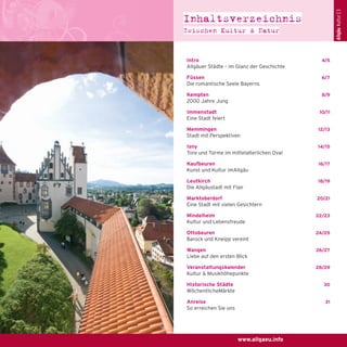 Das Dokument präsentiert die kulturellen Highlights und Attraktionen der zehn historischen Städte im Allgäu, die durch ihre beeindruckenden Baudenkmäler und lebendige Stadtkultur bestechen. Besucher können aus verschiedenen Freizeitangeboten, Veranstaltungen und Genuss-Paketen wählen, die Sightseeing, Kunst, Musik und Kulinarik kombinieren. Es wird eine Vielzahl von Freizeitaktivitäten, sowie Anreisemöglichkeiten und Insider-Tipps für einen bereichernden Aufenthalt geboten.