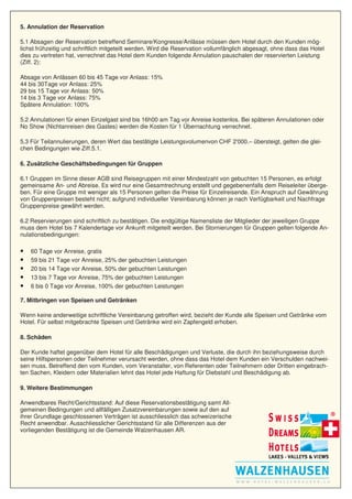 Die Allgemeinen Geschäftsbedingungen (AGB) des Hotel Walzenhausen regeln die Mietbedingungen für Veranstaltungsräume, die Durchführung von Veranstaltungen und die damit verbundenen Leistungen. Bei Vertragsabschluss ist eine schriftliche Bestätigung erforderlich, und es gelten spezifische Zahlungs- und Stornierungsbedingungen. Zudem haften Kunden für verursachte Schäden und müssen die endgültige Teilnehmerzahl rechtzeitig melden.