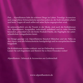 Alpenflüstern bietet trendige und ausgefallene Schmuckstücke sowie Accessoires, die Individualität ansprechen. Die handgefertigten Produkte sind in München inspiriert und werden ausschließlich im Onlineshop vertrieben. Die Kollektionen sind vielseitig und besonders, ideal für verschiedene Anlässe.