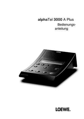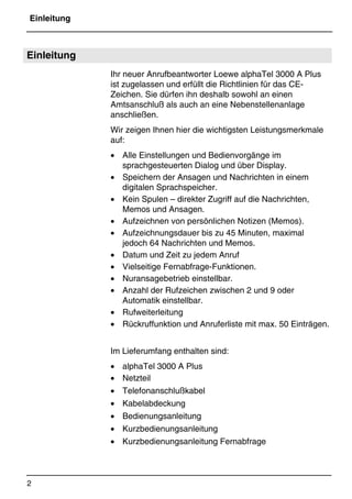 Die Bedienungsanleitung beschreibt den Loewes Anrufbeantworter Alphatel 3000 A Plus, der für den Anschluss an Amtsanschlüsse und Nebenstellenanlagen zugelassen ist und zahlreiche Funktionen bietet, wie digitale Sprachspeicherung und vielseitige Fernabfrage-Funktionen. Zudem werden Details zu den Einstellungen, Anschlussmöglichkeiten und zur Inbetriebnahme bereitgestellt, einschließlich der Notwendigkeit einer Batterie für Speicherschutz bei Stromausfall. Das Dokument beinhaltet auch eine detaillierte Geräteübersicht und eine Schritt-für-Schritt-Anleitung zur Nutzung und Pflege des Geräts.
